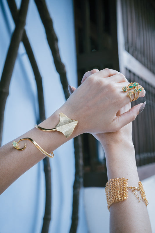 Descubre nuestra exclusiva colección de brazaletes, diseñados a mano con amor y dedicación. Cada par de pendientes está cuidadosamente elaborado con materiales de alta calidad y bañado en oro de 24 kilates.